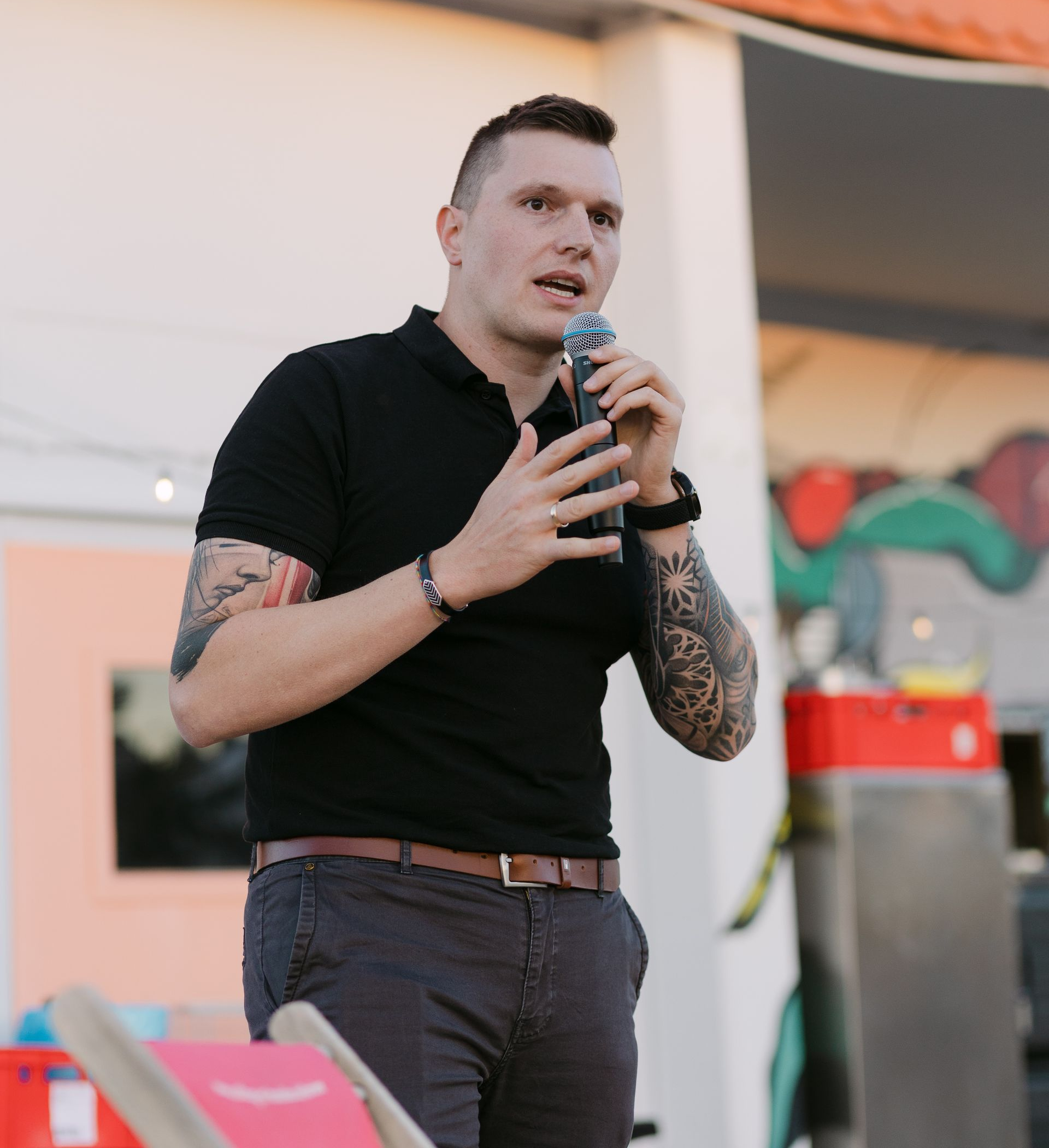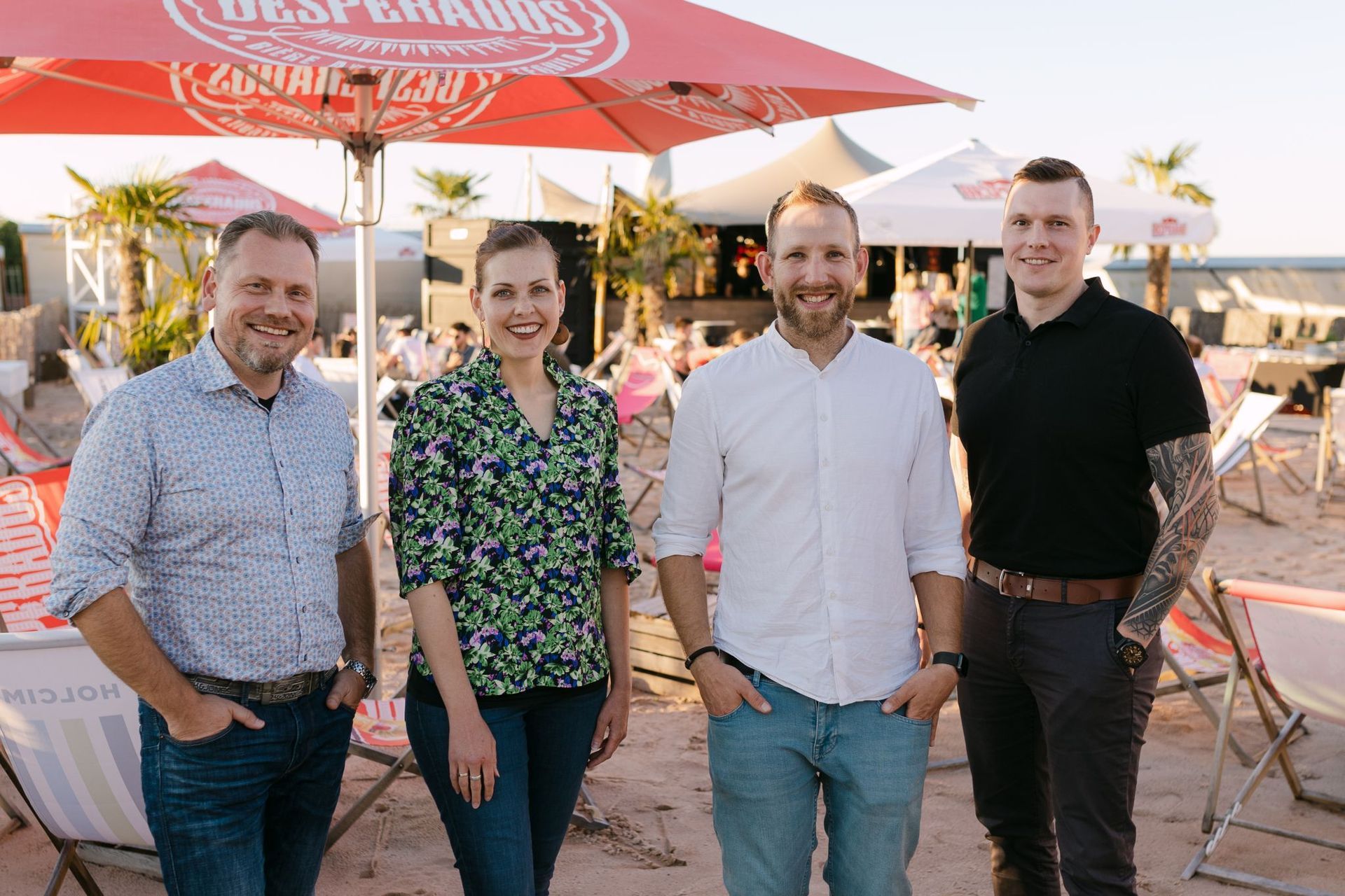 Das IHK-Gründergrillen initiiert durch die IHK Schwarzwald-Baar-Heuberg unter der Leitung von Marcel Trogisch (von links) und Marlene Roming, zusammen mit Thomas Makosch, Gastgeber und Geschäftsführer des beach0741, und ich - Timon Dürr - als Keynote-Speaker und Moderator des Abends - Bild von David Bendisch